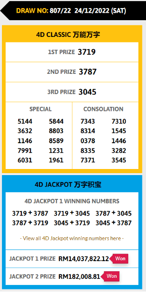 The winning numbers 3719 (1st Prize) and 3787 (2nd Prize) were the lucky winner’s numbers. 3719 was a permutation of his old car number, and 3787 was a random lucky number that caught his attention on that day he placed his bets.