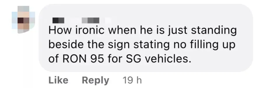“How ironic when he is just standing beside the sign stating no filling up of RON95 for SG vehicles.”