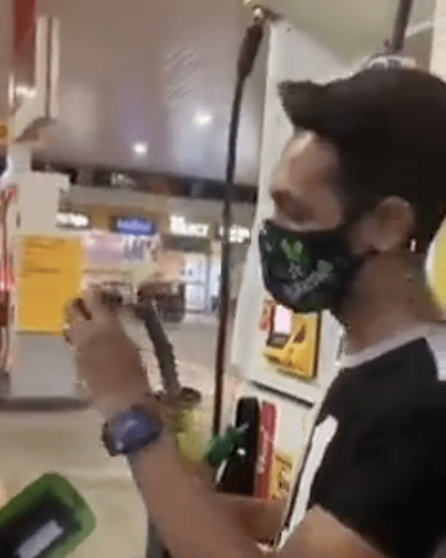 At the beginning of the clip, the cameraman asks the man why he’s pumping RON95 fuel into his car, to which he answered by pulling a small green bottle out of his pocket.