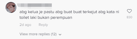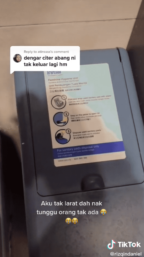 In the video, @rizqindaniel seemed to be frantic, realising he entered the wrong washroom after hearing voices of females talking outside his cubicle and spotting the women’s trash bin.