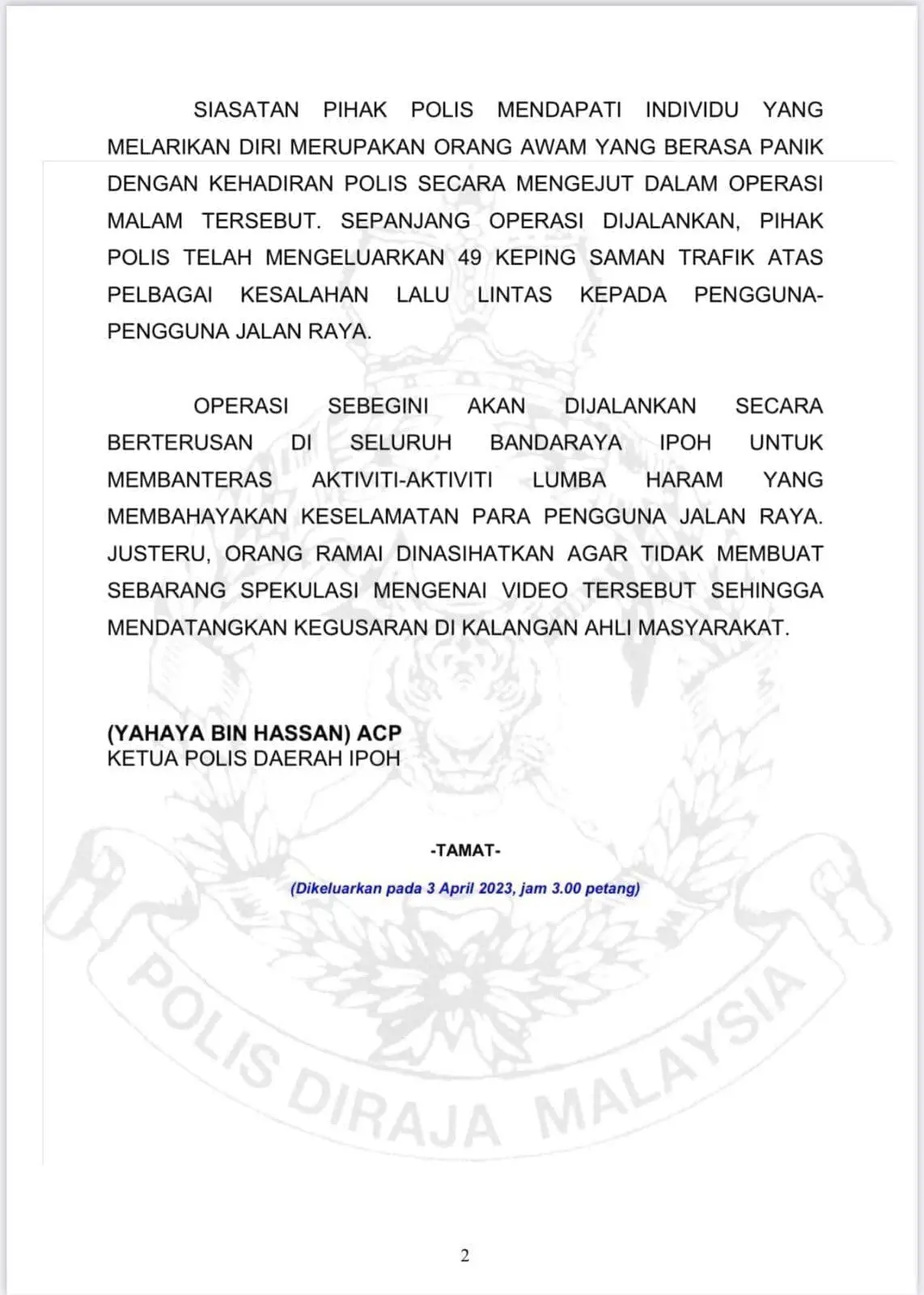 A viral video showing a man frantically fleeing from the police during an operation to crack down on “mat rempit” activities in Ipoh has been making the rounds on social media.