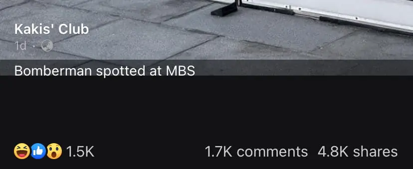 The image was initially posted on the Facebook page “Kakis’ Club” with the rather unconventional caption, “Bomberman spotted at MBS.”