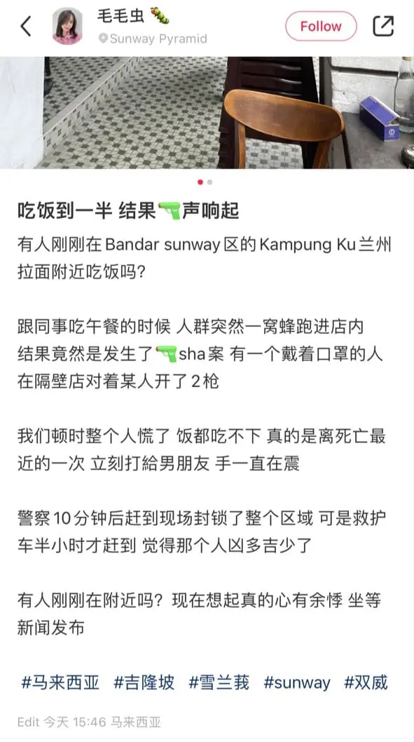 A woman who was near the scene shared her harrowing encounter. She was dining at a nearby restaurant, Kampung Ku Mi Tarik, when she heard gunshots. She then recounted her experience on Xiaohongshu, a popular social media platform.