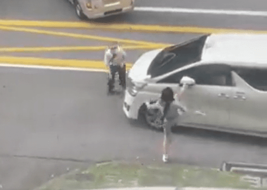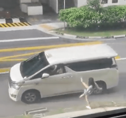 Unfazed by the slap, the woman rushed over the car and kicked the side mirror, prompting the man to charge towards her but stopped when he saw her fall backwards onto the ground.