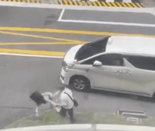SINGAPORE – A middle-aged man and a young woman were caught on tape exchanging heated words with each other before coming to physical blows by the roadside.