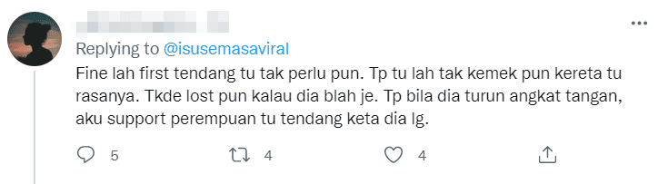 “Fine, she didn’t need to kick (the car) at first. But that didn’t put a dent in his car and he didn’t lose anything either. But when he came down and lifted his hand (towards her), I support the lady’s action of kicking his car.”
