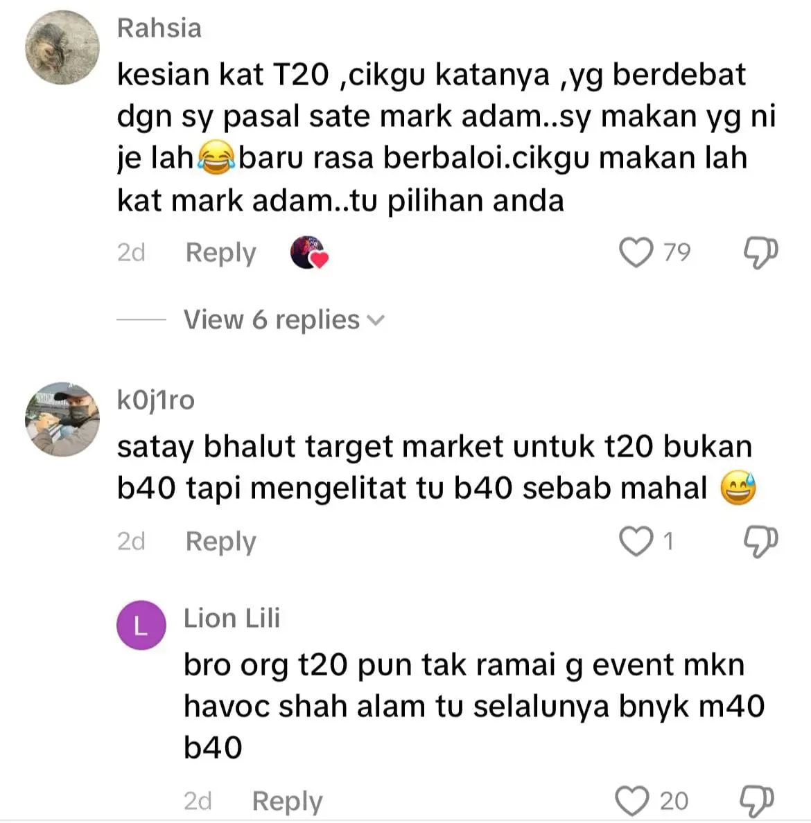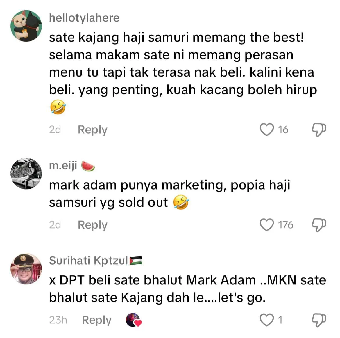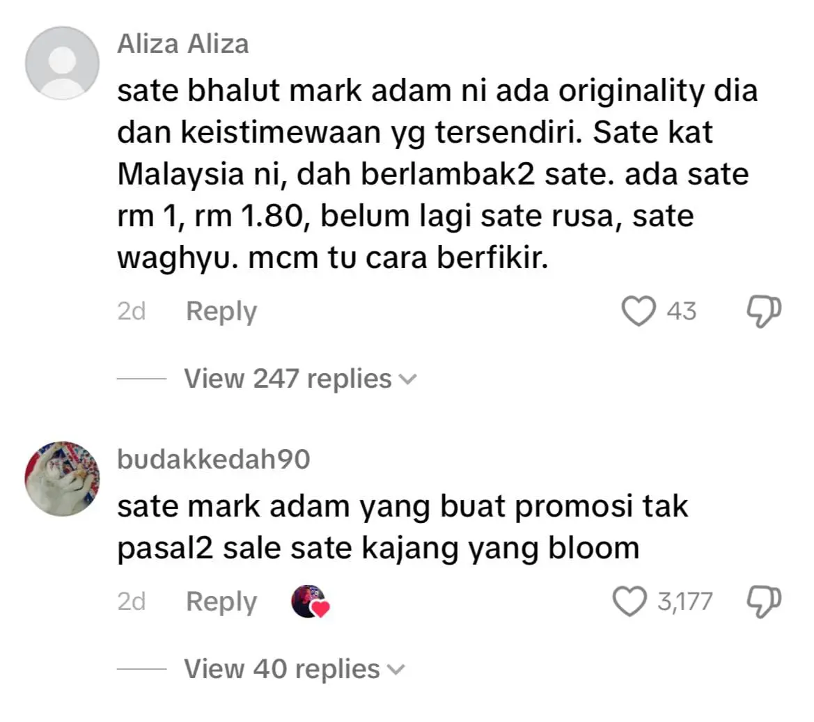 “Kalau nak merasa sate balut dengan kulit popiah, cari je kat Sate Kajang Haji Samuri. Sate Bhalut Mark Adam tu bukan mahal, cuma kau je yang tiada duit,” tulisnya.