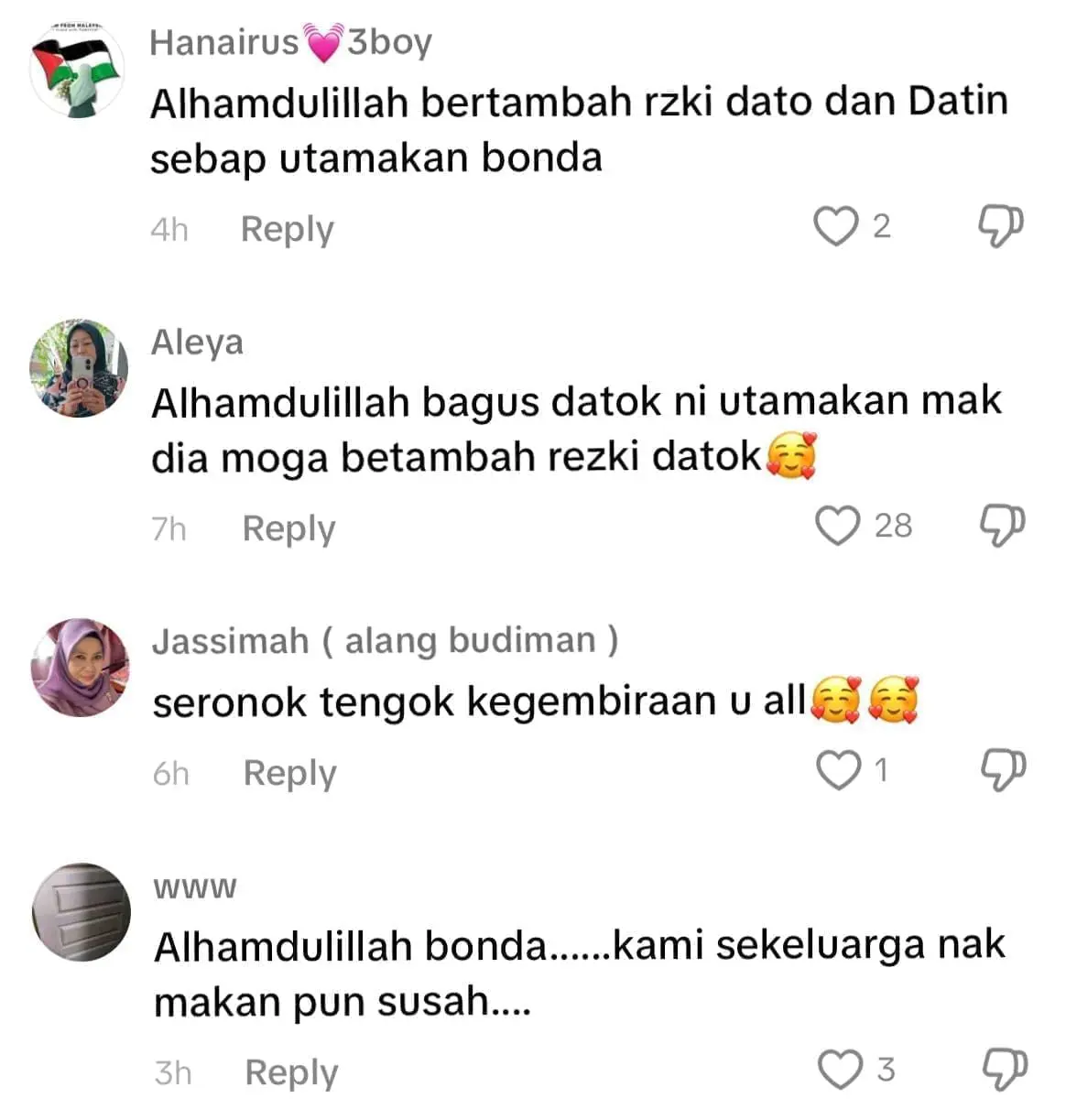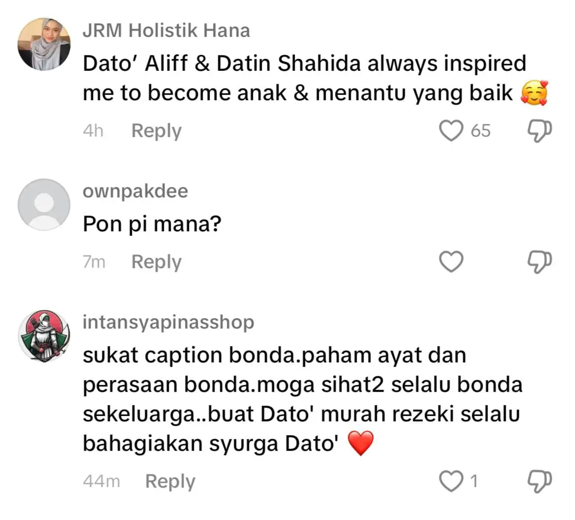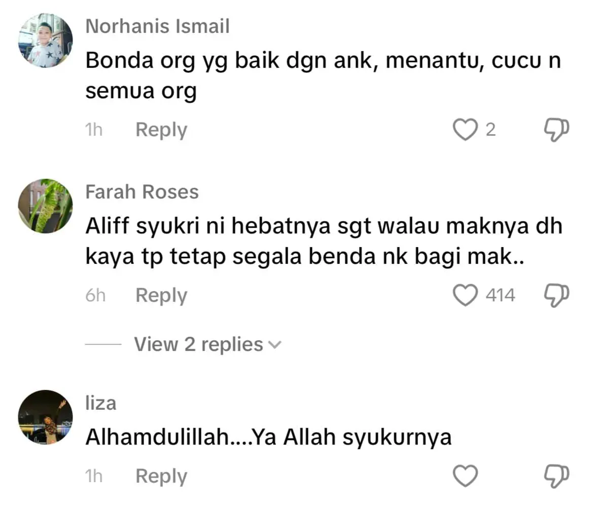 Meninjau ke ruangan komen, warganet memuji sifat Aliff Syukri yang sentiasa menyayangi ibunya dan ada juga yang mendoakan agar usahawan terbabit sentiasa dimurahkan rezeki dan dipermudahkan segala urusan.