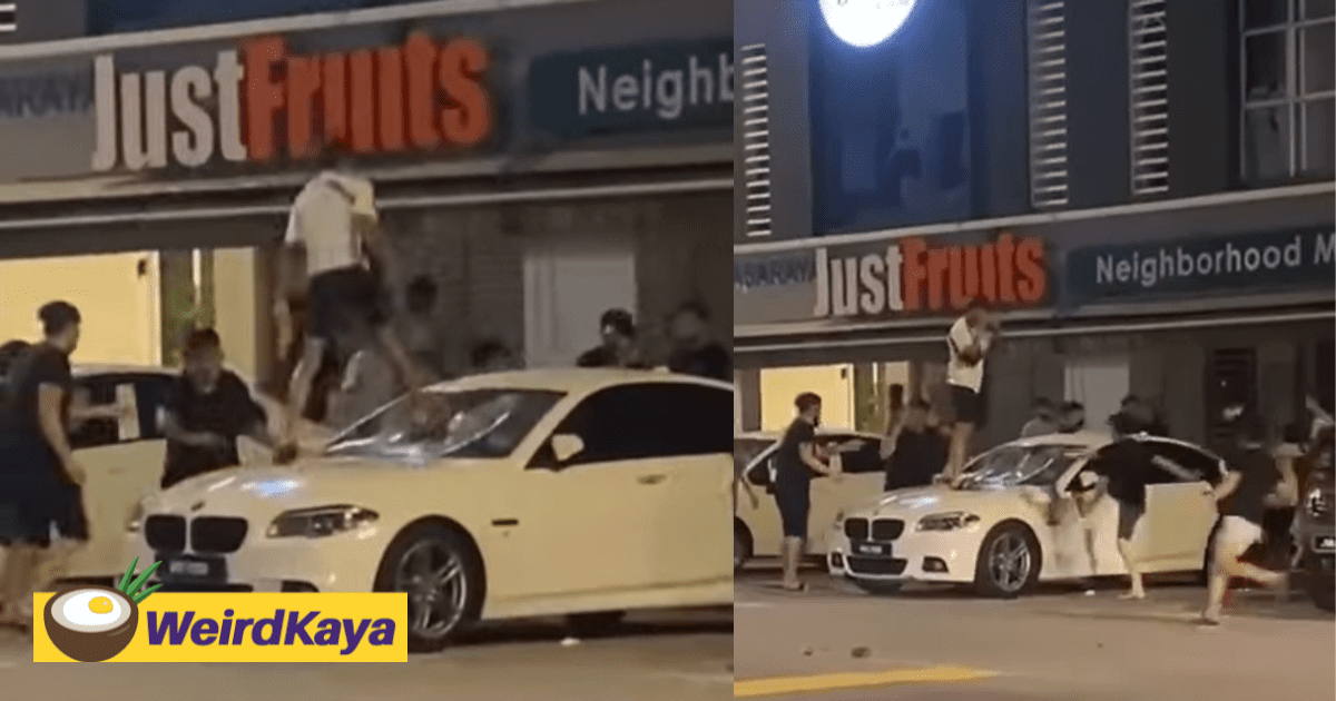 In the midst of the fight, several parked vehicles including a BMW and a lorry along Jalan Sri Radin were damaged.
