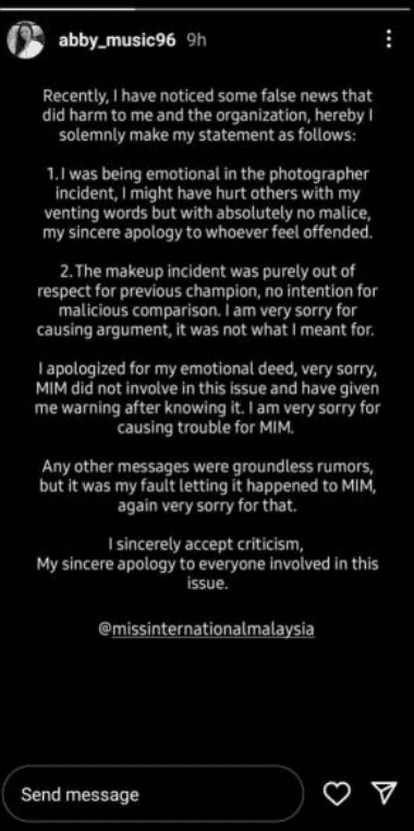 In the statement, she started off by saying that she and Miss International Malaysia (MIM) were harmed by “false news” that have gone viral online.