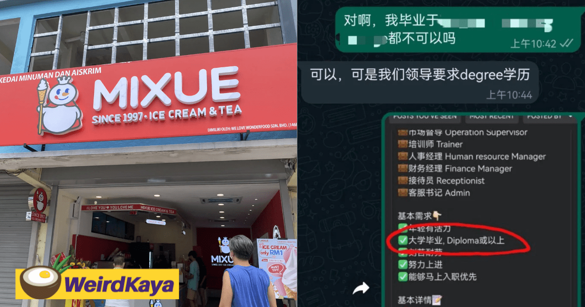 Popular Chinese tea-based beverage franchise Mixue Malaysia is currently facing heat after it allegedly told a woman that they would only hire degree holders.