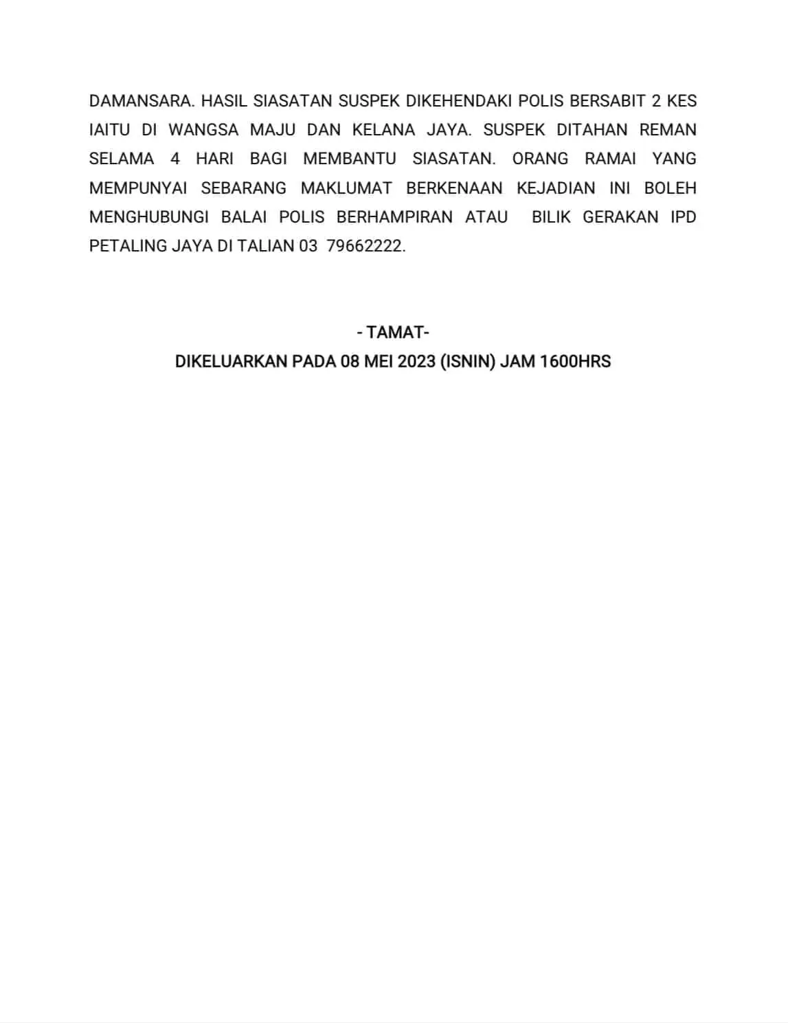 “The police investigation shows that the suspect is wanted by the Wangsa Maju and Kelana Jaya police. If the public has information about this case, they can contact the Petaling Jaya Police District Headquarters at 03-7966 2222 or go to a nearby police station to provide information for the investigation.”
