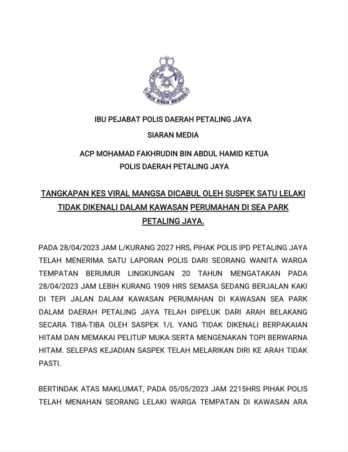 Mohamad Fakhrudin, the chief of the Petaling Jaya police district, issued a statement stating that the victim (20 years old) was walking alone in the vicinity of Sea Park residential area at 7:09 pm on April 28, and was unexpectedly grabbed from behind by an unidentified man wearing black clothes, a face mask, and a black hat. The man immediately ran away after succeeding.