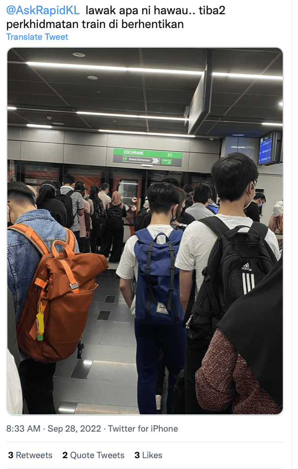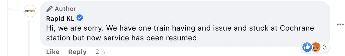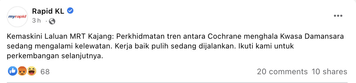 In a follow-up post, RapidKL also shared that train service from MRT Cochrane to MRT Kwasa Damansara was experiencing delays.
