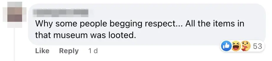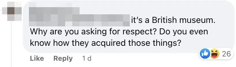 On the other hand, some felt that the British Museum did not deserve any respect due to its history of displaying antiques and ancient treasures allegedly stolen from countries which were formerly colonised by Britain.