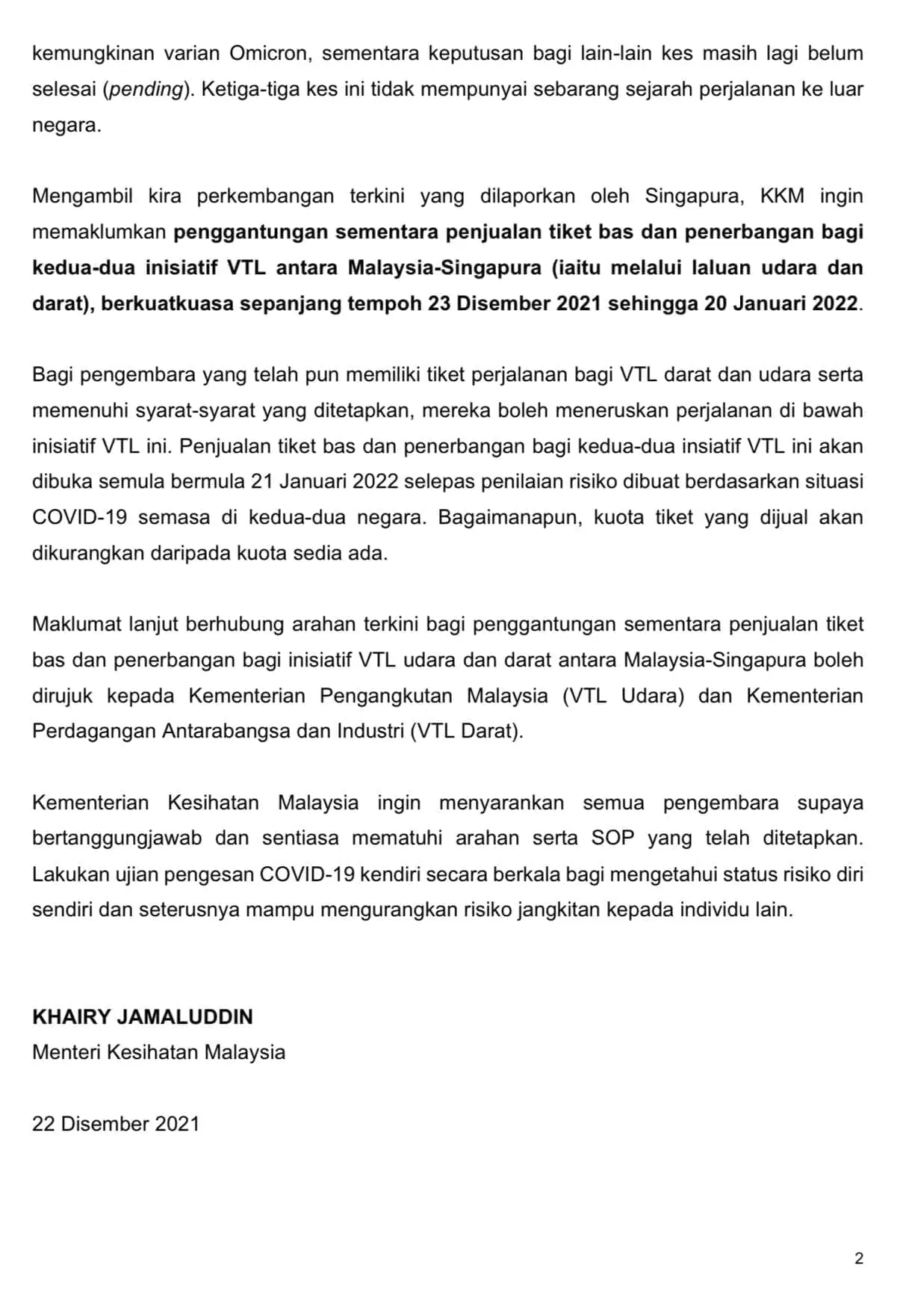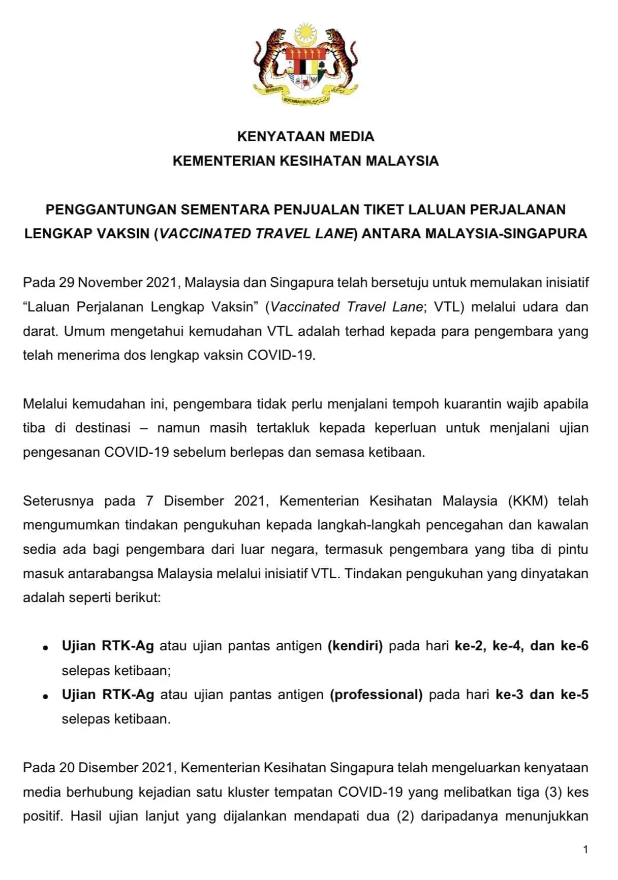 PUTRAJAYA – Ministry of Health (MOH) has issued an official statement through social media platforms to announce that the Vaccinated Travel Lane (VTL) between Malaysia and Singapore will be temporarily suspended from tomorrow (23 Dec) to 20 Jan 2022.