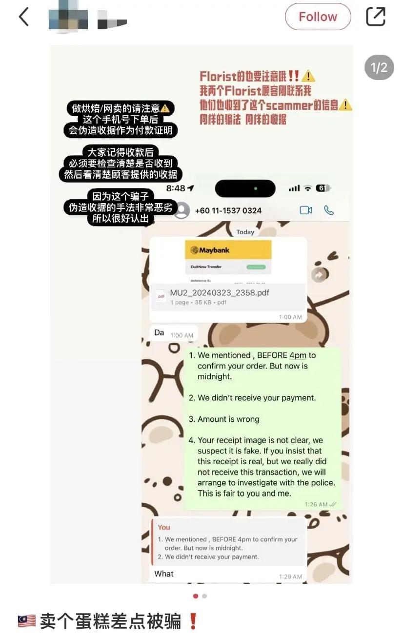 A baker in Kuala Lumpur shared a cautionary tale on Xiaohongshu, revealing how he nearly became the victim of a scam that sought to exploit the trust of unsuspecting sellers.
