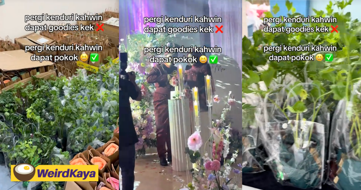 The caption humorously reads: “Pergi kenduri kahwin dapat goodies kek ❌. Pergi kenduri kahwin dapat pokok ✅” (Going to a wedding and getting cake? Nope. Going to a wedding and getting a plant? Yes!).