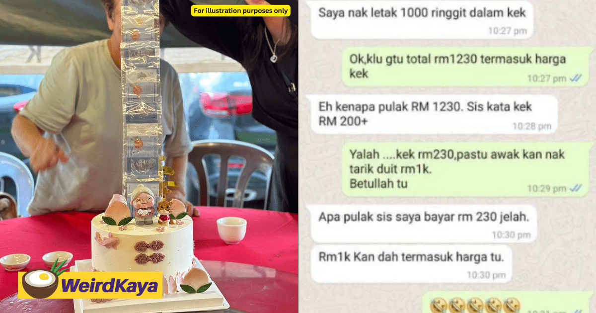 When informed that the cake, inclusive of the RM1,000 cash, would cost RM1,230, the customer was baffled, believing the cash inside the cake should be part of the cake’s cost.
