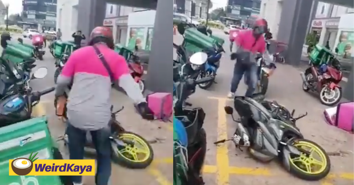 The incident occurred in a designated delivery rider’s parking area outside a mall in Puchong, and saw the man violently damaging his vehicle, which had fallen to its side.