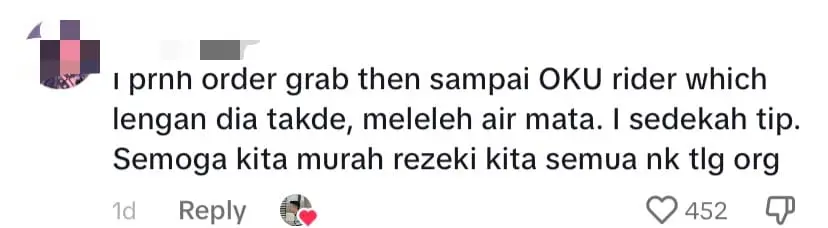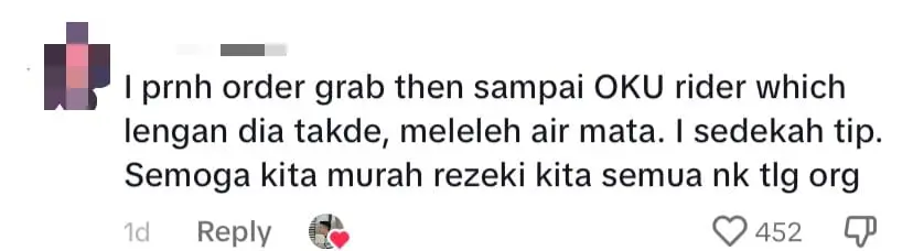 “I once ordered from Grab and was moved to tears when the rider who arrived had a missing arm. Touched by the encounter, I gave him a tip. May we all be blessed with abundant provisions to continue helping others.”