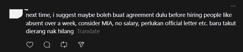 In a Threads post, the frustrated employer wrote that the worker reported for work on Aug 28 before being “missing in action” (MIA) from Aug 30 onwards.