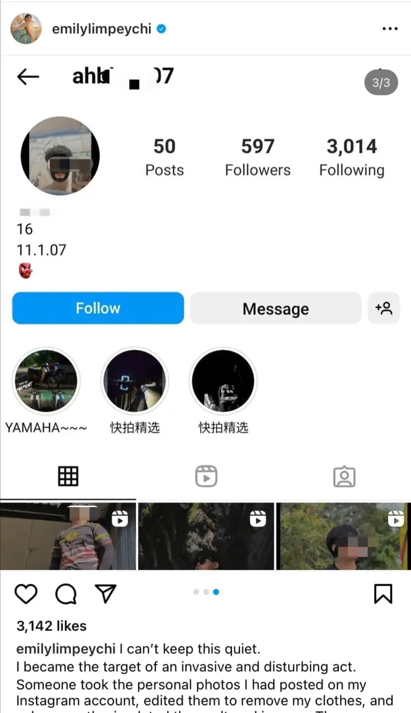 In a harrowing tale of online harassment, a popular Malaysian actress, Emily Lim, has come forward about a deeply disturbing incident. Taking to her Instagram, she revealed that a person had taken her personal photos, digitally manipulated them to appear nude, and circulated these altered images.