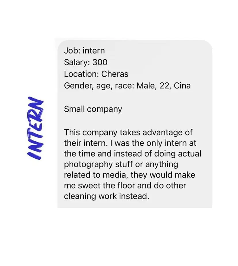 According to an Instagram post by MalaysianPayGap, a page that shares information about workplace salaries, the 22-year-old Chinese-Malaysian university student shared the ordeal of interning at a small company in Cheras.