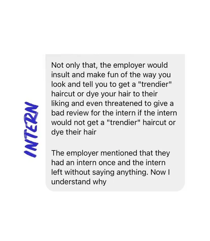 Moreover, the employer threatened to give him a poor review in his internship report if he didn’t comply with her demands regarding his personal appearance.