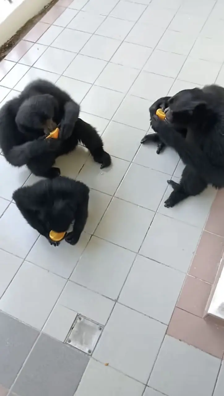 Seated in a circle, the monkeys contentedly nibbled on their oranges, enjoying a moment of quiet indulgence.