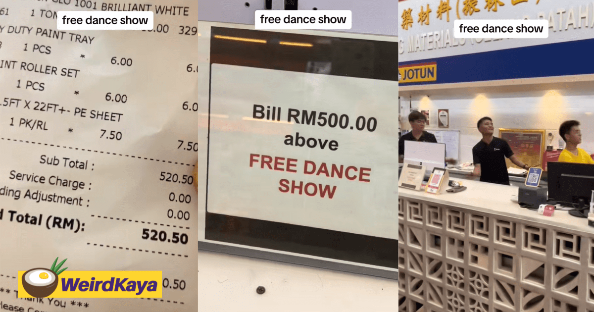 In the video, Fandy displays his receipt after purchasing paint items totaling RM520.50. With a grin, he points the camera toward a sign near the cashier announcing a free dance show for purchases over RM500.