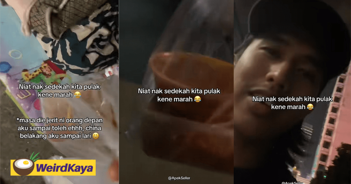 In a TikTok video shared by @apekseller, it showed him approaching a homeless woman sitting by the side of road while holding a plastic bag of food in his hand.