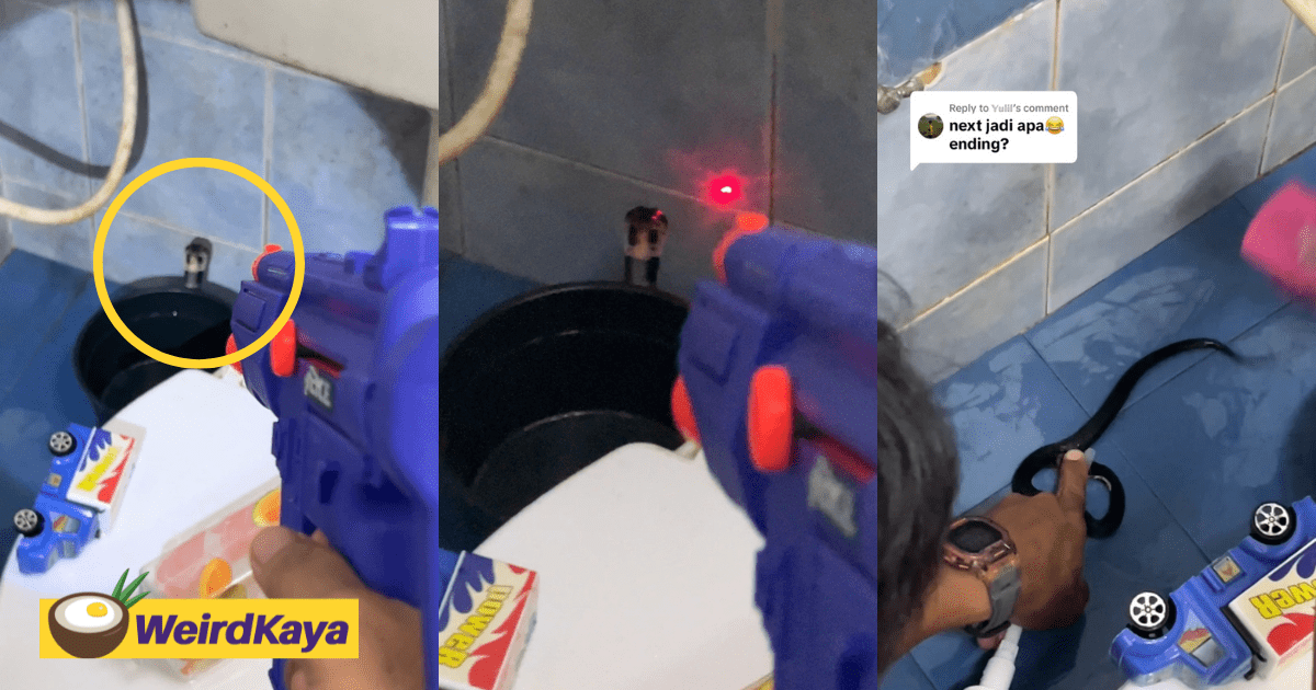 In a viral TikTok video shared by user @camieuls, this fearless fellow is seen doing “bang bang” with a toy gun at a small snake peeking out from behind a pail in a toilet.