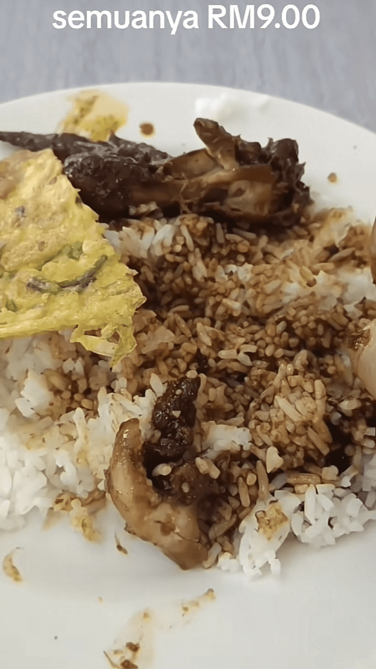 To his surprise, a basic meal of mixed rice, chicken, an egg, and an iced milk tea cost 9 ringgit.
