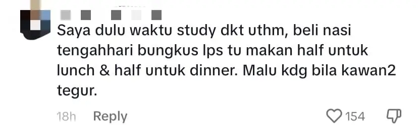 Another reflected on their time studying at UTHM, where they would buy lunch and split it into two meals – half for lunch and the remaining half for dinner.