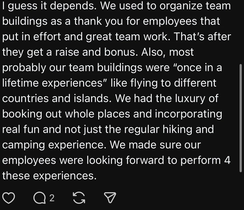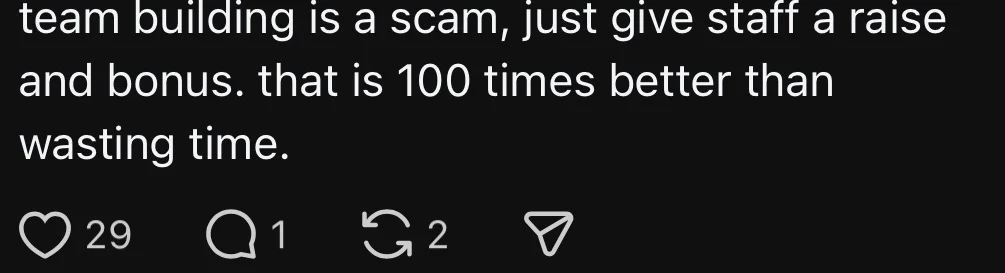 One commenter wrote: ‘Team building is a scam. Just give staff a raise and bonus. That is 100 times better than wasting time.’