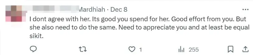 “I don’t agree with her. It’s good that you spend for her. Good effort from you. But she also needs to do the same. Need to appreciate you and at least be equal a bit.”