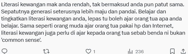 “Your mum’s financial literacy is low, but that doesn’t mean you should follow suit. The next generation should be more advanced and knowledgeable. Learn and improve your financial literacy, then teach your parents what you’ve learned,” said one commenter.