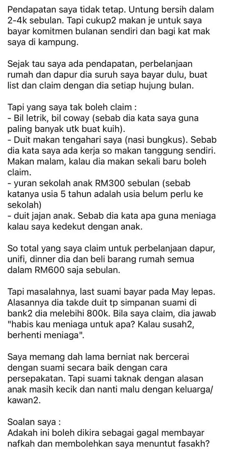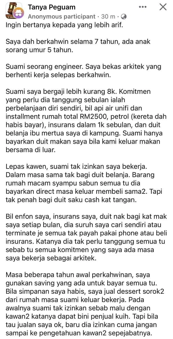 The story, initially posted in the “Tanya Peguam” Facebook group (which translates to “Ask a Lawyer”), was later reshared by user @AidaSue on platform X.