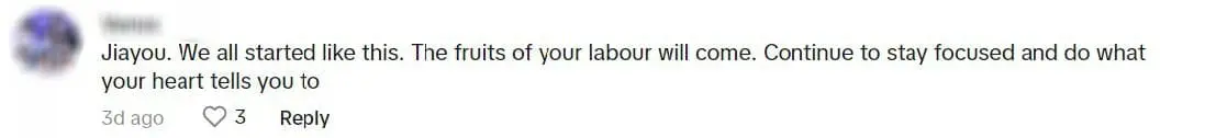 “Jiayou. We all started like this. The fruits of your labour will come. Continue to stay focused and do what your heart tells you to”