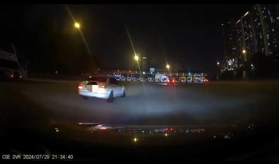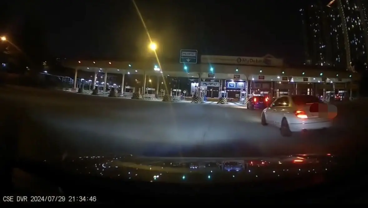 As the vehicles approach the toll plaza, the white Mercedes driver attempts to enter the Touch ‘n Go (TNG) lane but ends up sticking closely to the back of the other car.