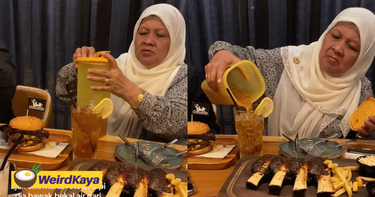Recently, a TikTok user, Farhan, posted a video of his mother bringing a big bottle of homemade drink, Teh ‘O’, to a Western steak restaurant because the price of the beverages are expensive.