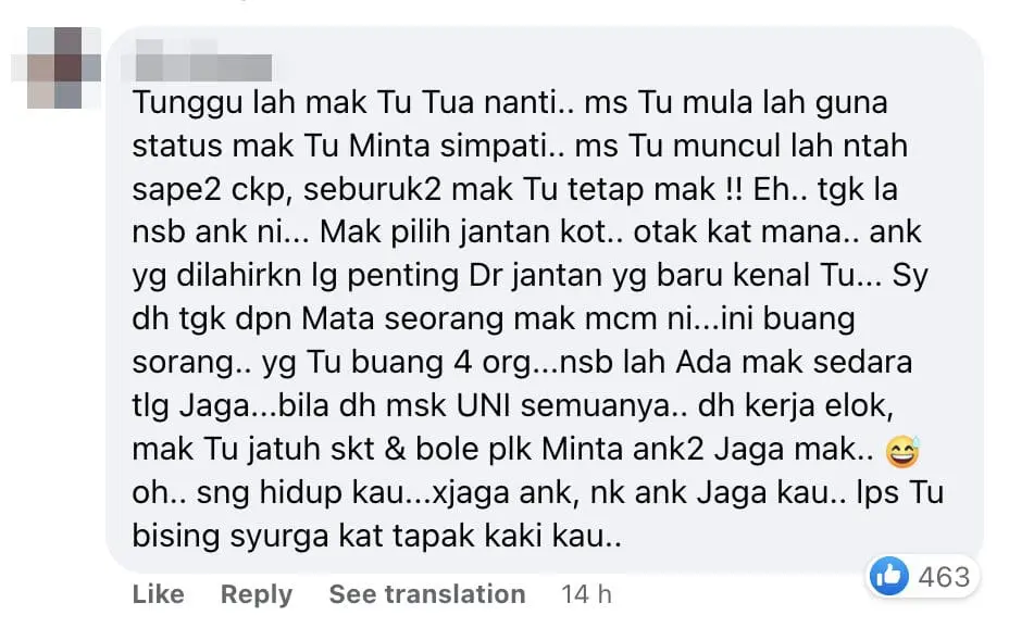 “Just wait until the mother gets old, then she’ll start using her status as a mother to seek sympathy. Then, who knows who will come forward and defend her by saying that she’ll always be a mother no matter what.’