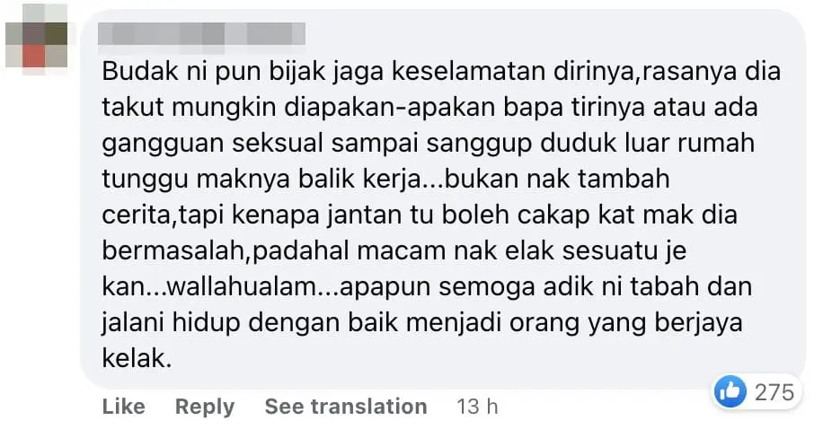 ‘It seems like she’s afraid of what her stepfather might do to her or she may have experienced sexual harassment, hence why she’s willing to wait outside the house for her mother to return from work….regardless, may this child be resilient and become a successful person in the future.’