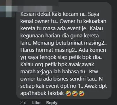 “It’s a pity how people are criticising this guy’s car. I know the owner personally. He only brings out the car for events. For daily use, he has another car. Everyone has their own interests, and we should respect that. I saw some comments even mentioning his father. If someone mentioned your father, wouldn’t you get angry? Watch your language. By the way, the owner has his own business. And every time there’s an event, he gets the first place. What have you achieved? Nothing but dust.“