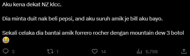 One netizen shared an encounter at KLCC where they offered to cover a Pepsi for someone. To their surprise, the individual added Ferrero Rocher chocolates and three bottles of Mountain Dew to the bill.