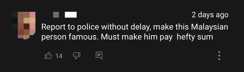 “Report to police without delay, make this Malaysian famous. Must make him pay hefty sum.”