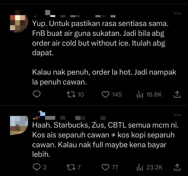 Many said that this was a common practice among beverage chains such as Starbucks and Zus Coffee, where there was a certain measurement for iceless drinks and that customers might have to pay more if they wanted a full cup.