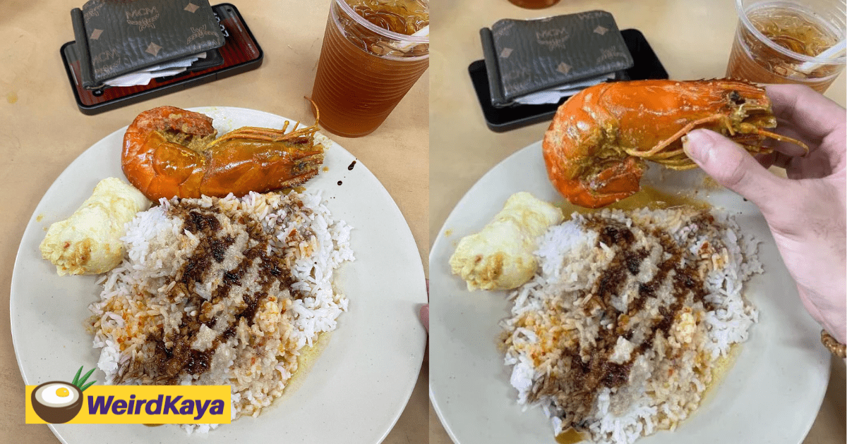 Based on the photo, his meal consisted of rice, one piece of tiger prawn, a fried egg, and some gravy drizzled on the rice. Together with the drink, the meal cost him a total of RM37.