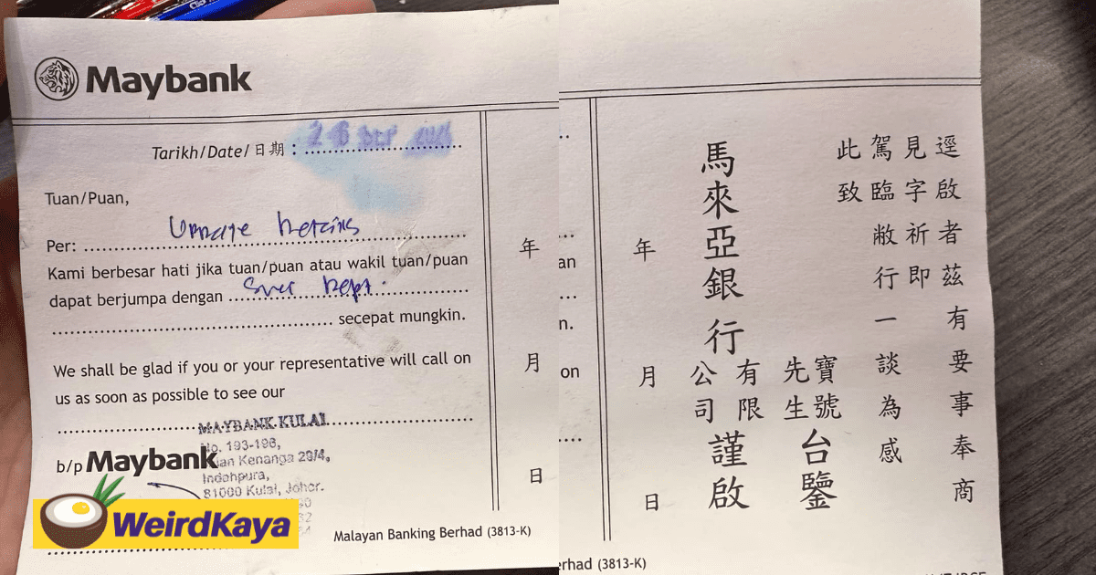 The notice, issued by Maybank’s Kulai branch in Johor and dated September 26, 2024, requested the recipient to visit the bank’s savings department.